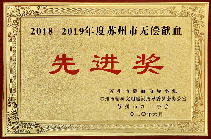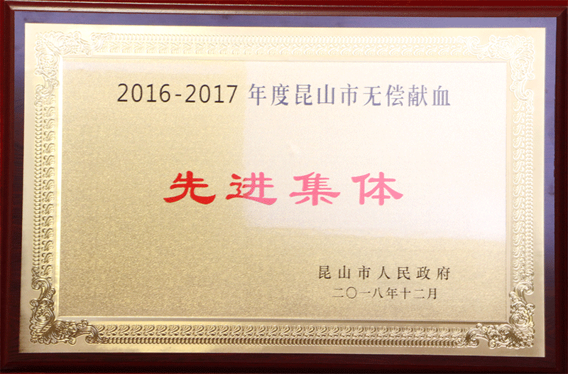 荣获【2016-2017年度昆山市无偿献血先进集体】称号